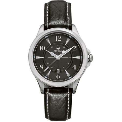 This Bulova ladies' Adventurer has a sporty look with its black leather strap and contrast stitching. . . . . White dial with silver tone hands and markers . . Stainless steel case . . 24 hour inner dial with silver/white tone numerals . . Date window at the 6 o'clock position . . Black leather strap with contrast stitching . . Water resistant to 30 meters (100 feet) . . 31mm case width (approximately 1 1/4 inches) . .